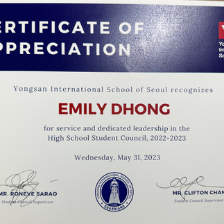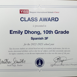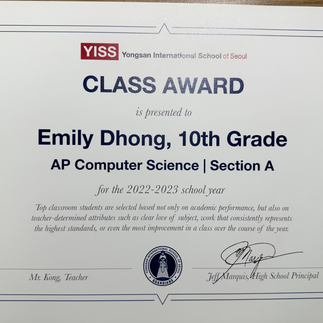 Especially by the end of AP seasons and Student Council election (by the way, I was elected as 11th-grade representative for the 2023-24 school year!), I was filled with so many fun school events that time flew by in a flash. Overall, I am so grateful for the people around me and God who helped me achieve all the things I never imagined of. The awards that YISS gives out at the end of the year truly caught me by surprise when they called out my name.